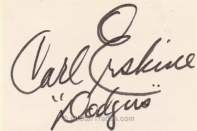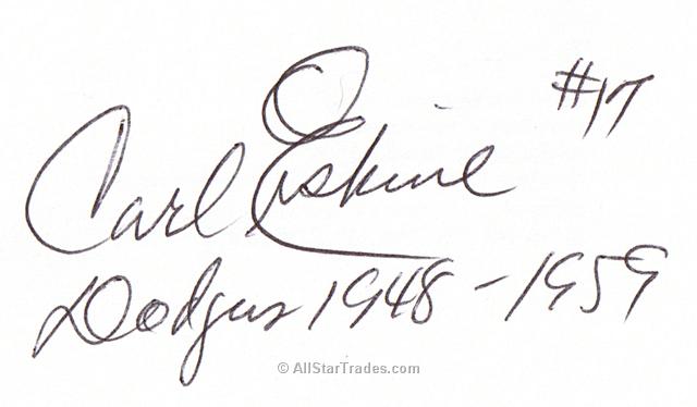 Carl Daniel Erskine (born December 13, 1926) is a former right-handed starting pitcher in Major League Baseball who played his entire career for the Brooklyn and Los Angeles Dodgers from 1948 through 1959. He was a pitching mainstay on Dodger teams which won five National League pennants, peaking with a 1953 season in which he won 20 games and set a World Series record with 14 strikeouts in a single game. Erskine pitched two of the NL's seven no-hitters during the 1950s. Following his baseball career, he was active as a business executive and an author. https://en.wikipedia.org/wiki/Carl_Erskine