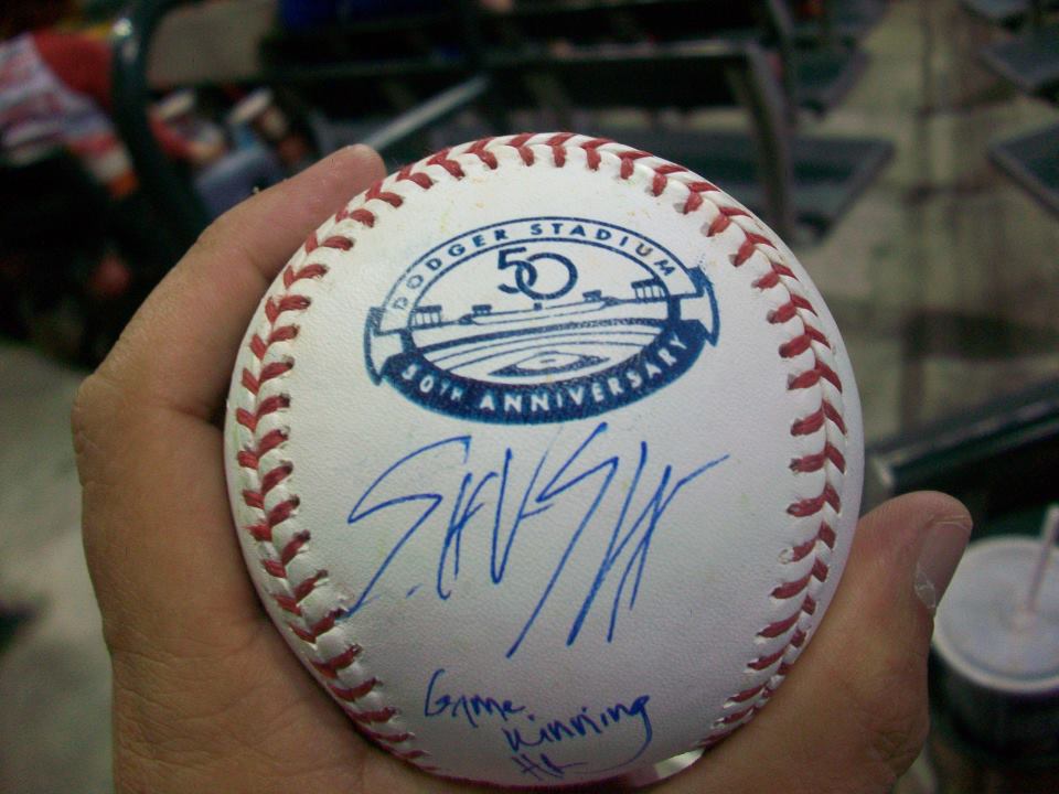 Scott Van Slyke was my most favorite Dodgers Prospect and seeing come up in the Majors recently was special to me. He recently hit a walk off home run a week ago on 5/20 and the next day when I saw him for the first time since Spring Training, he signed one of my 50th Anniversary Dodger Stadium Baseballs. He game winning home run on my ball which will be a special addition to my Dodger collectibles.